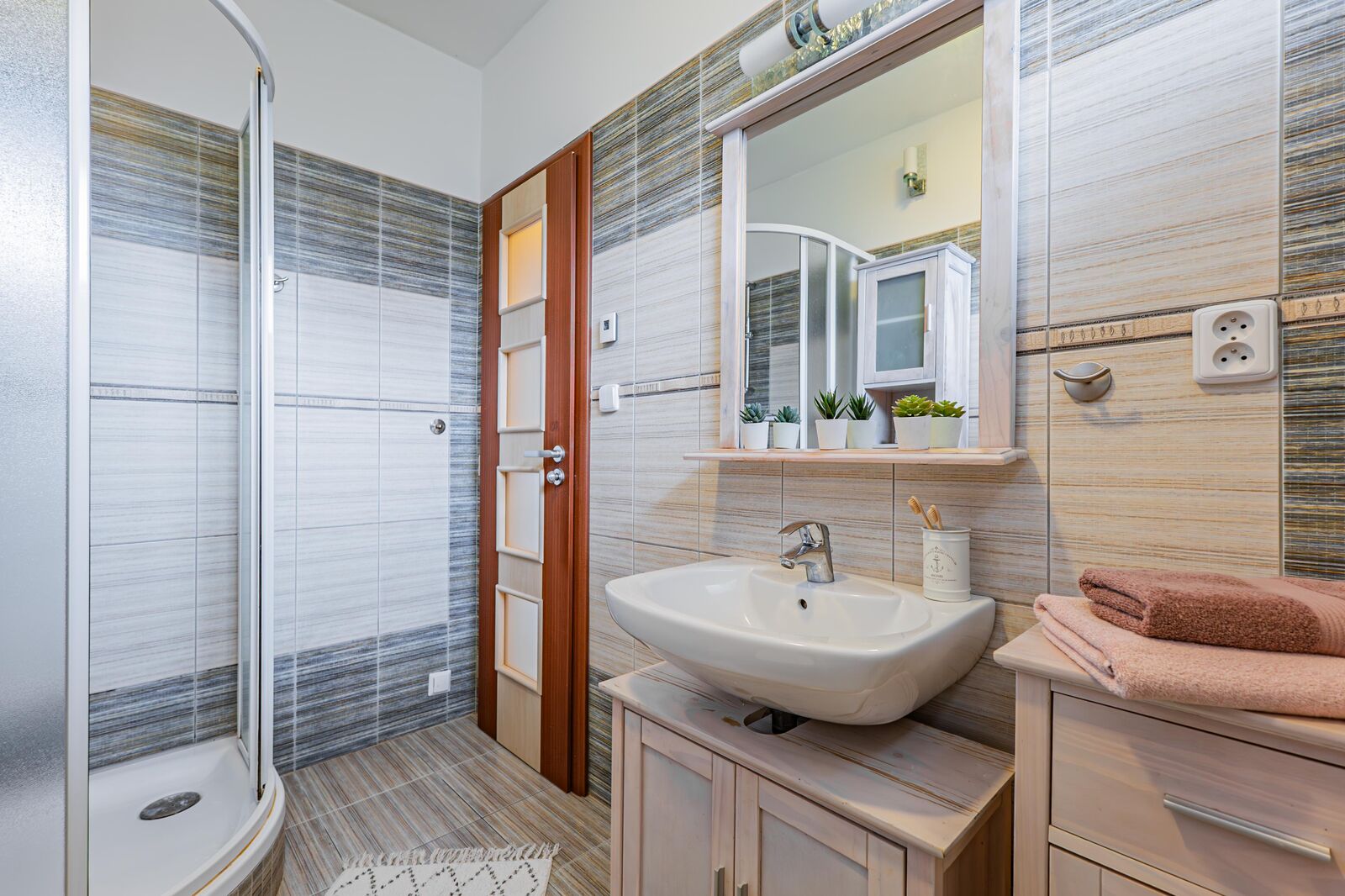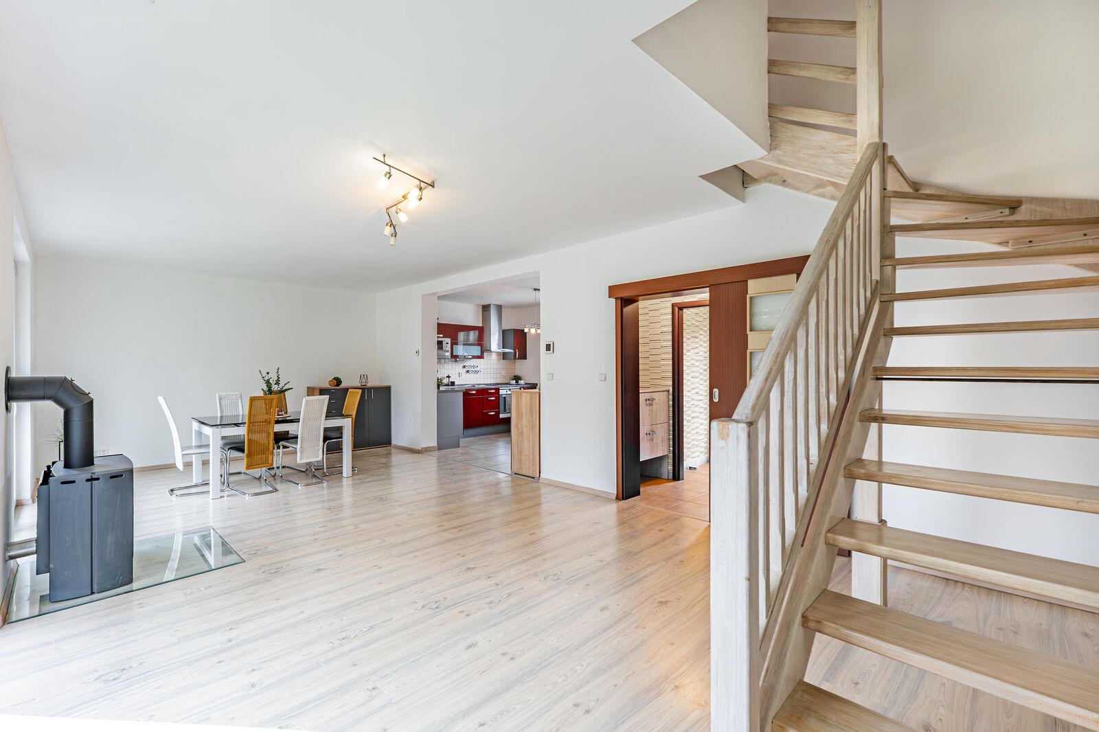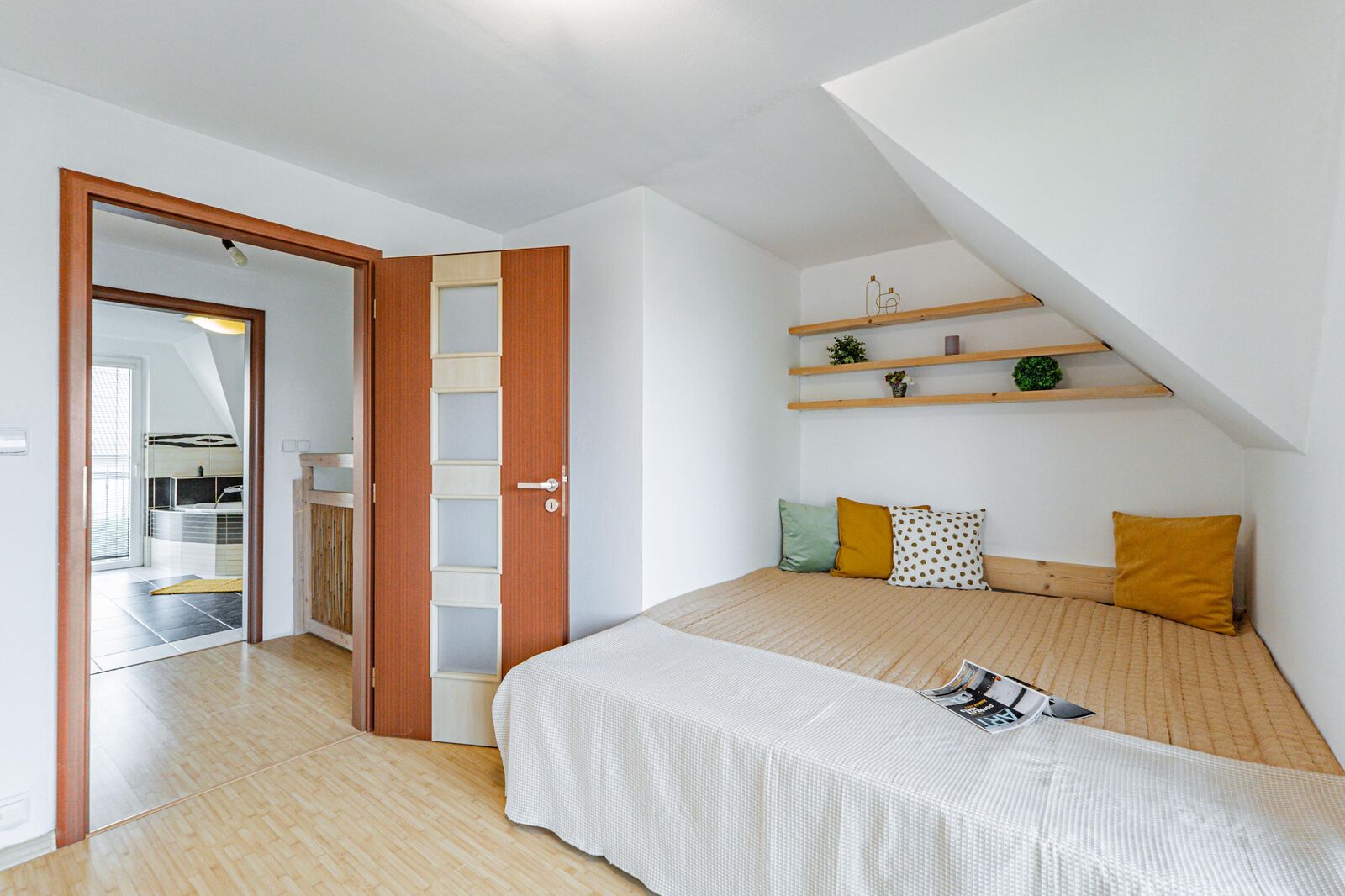 Dům je zateplený a disponuje dvěma podlažími a pochozí půdou, na kterou je přístup po spouštěcím schodišti. Interiér je vybaven moderně a prakticky. Dominantou domu je prostorný obývací pokoj, který je částečně oddělen stěnou od kuchyňské linky, jejíž součástí je zabudovaná trouba, varná deska, mikrovlnná trouba, digestoř, nová myčka a americká lednice LG s krystaly Swarovski v barvě kuchyňské linky, tak aby k sobě vše hezky ladilo. V každém podlaží je vám k dispozici koupelna s toaletou.