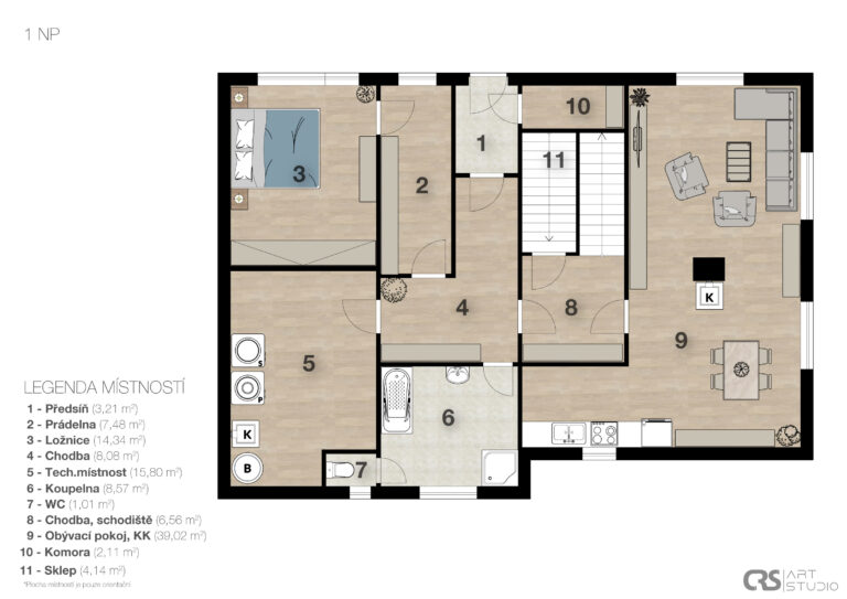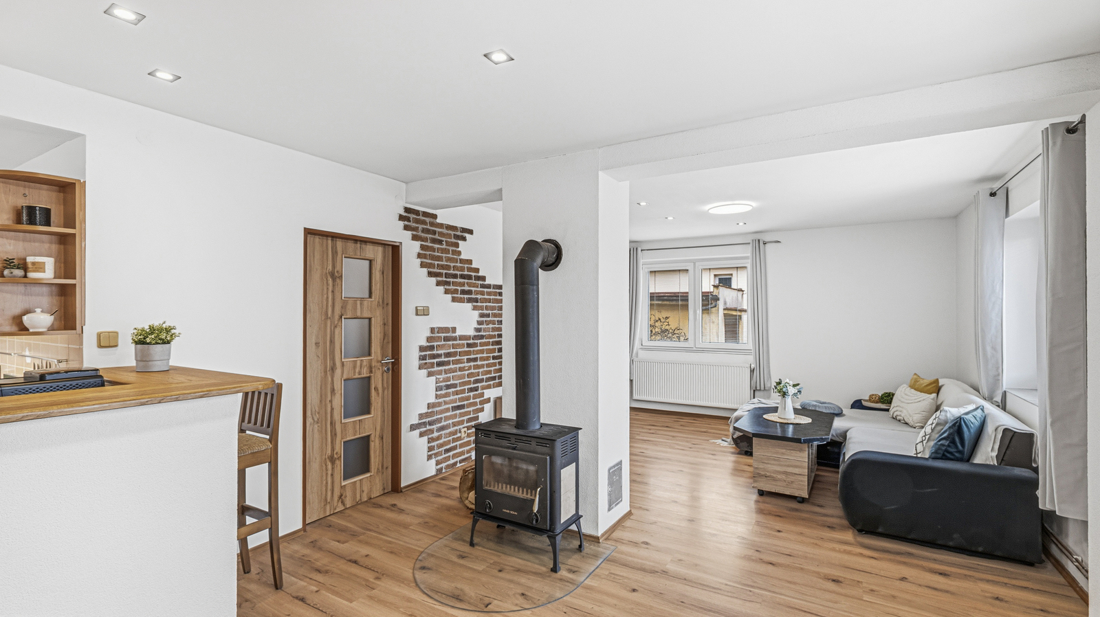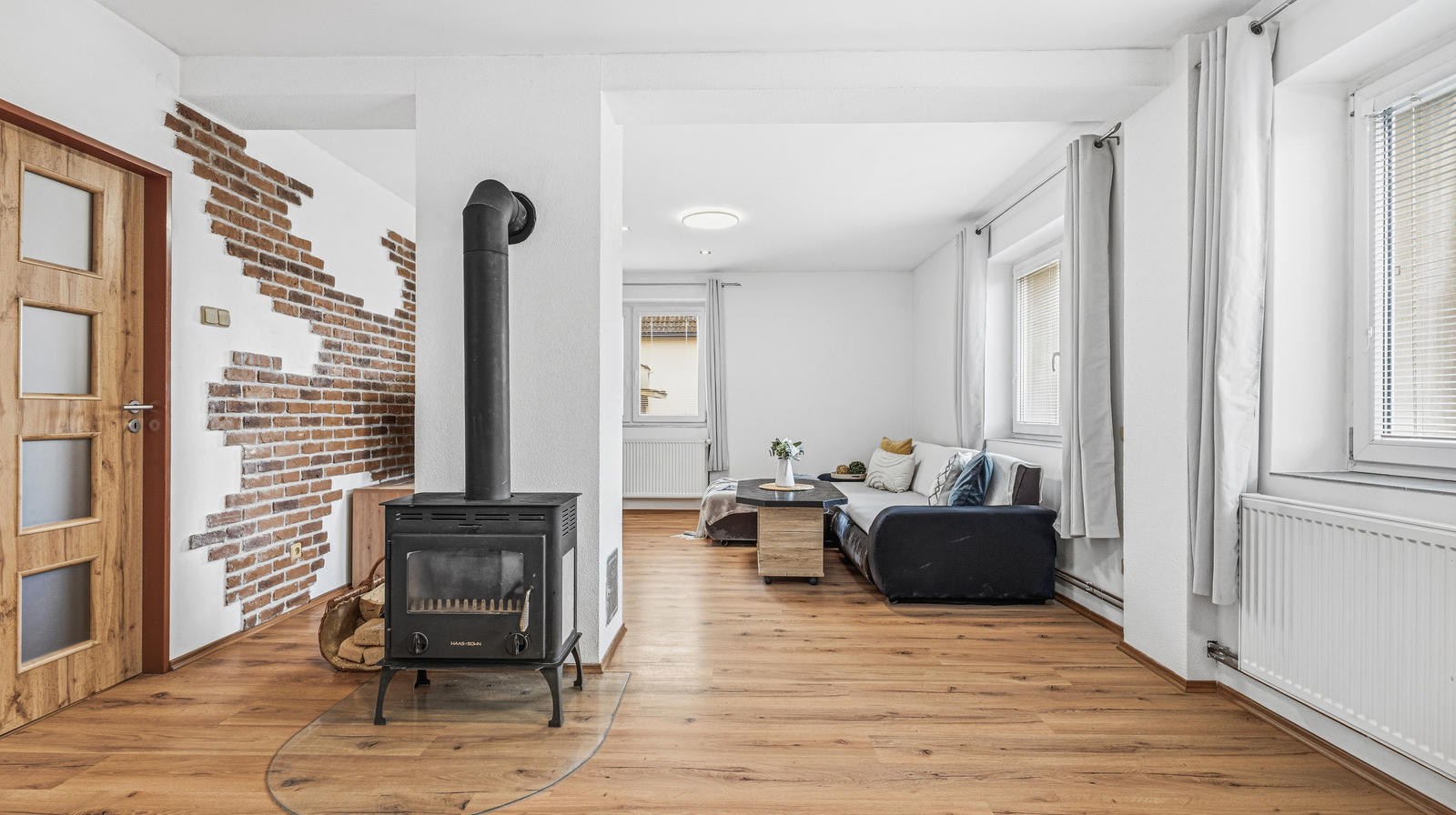 V přízemí se nachází obývací pokoj s kuchyňským koutem a krbovými kamny, která vytvářejí příjemnou atmosféru zejména v zimních měsících. Dále je zde ložnice, koupelna s vanou i sprchovým koutem, samostatné WC a technická místnost se vstupem ven. Ve druhém podlaží se nacházejí další obytné pokoje, které mohou sloužit jako dětské pokoje, pracovna nebo další ložnice. Nabízejí tak dostatek prostoru i soukromí pro každého člena domácnosti. Součástí domu je také sklep.