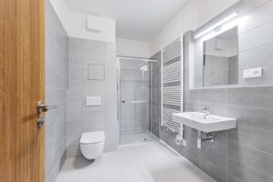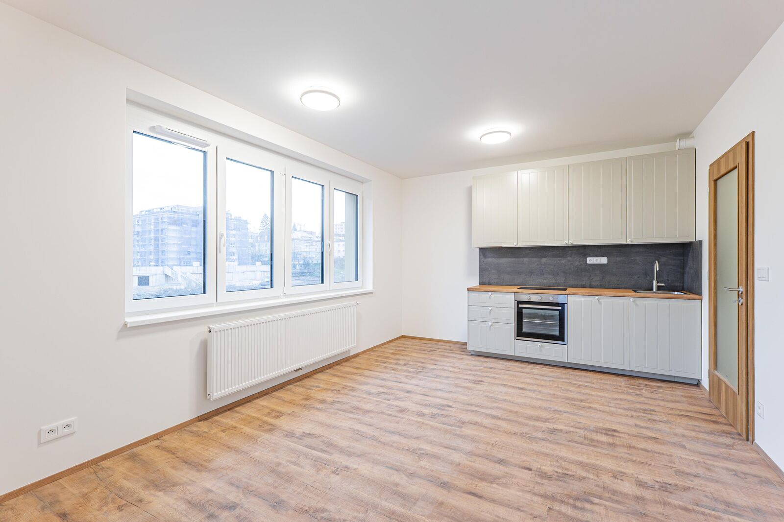Vybavení bytu zahrnuje moderní kuchyňskou linku s myčkou, troubou a indukční deskou. V koupelně je velký sprchový kout, toaleta, umyvadlo a otopný žebřík. Dále zde najdete ložnici s velkými francouzskými okny s přístupem na prostornou terasu o výměře 7,5 m2. Samozřejmostí jsou také plastová okna, která zajišťují správnou tepelnou izolaci a zároveň dostatek přirozeného světla. Standardy bytu působí útulně a moderně díky neutrálním barvám a dřevěným prvkům.