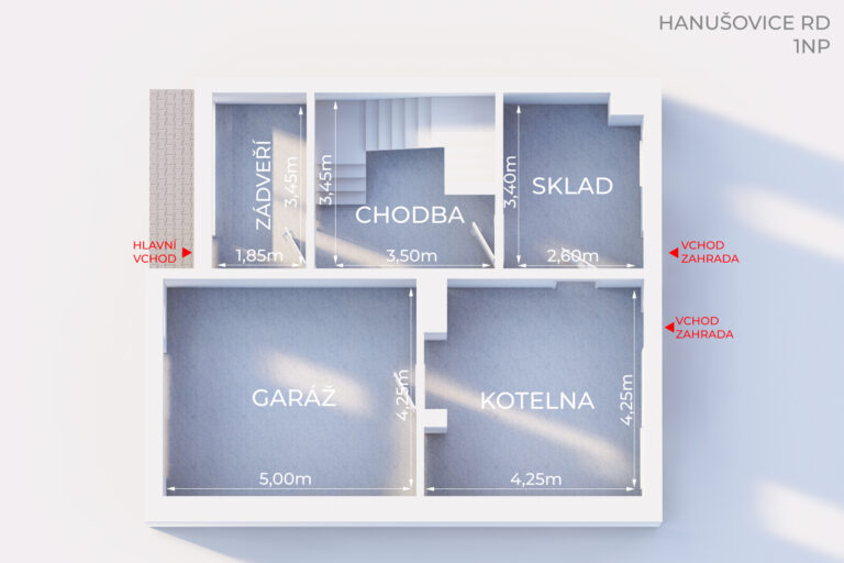 vstupní zádveří, hala s výtahem, prádelna, technická místnost a garáž