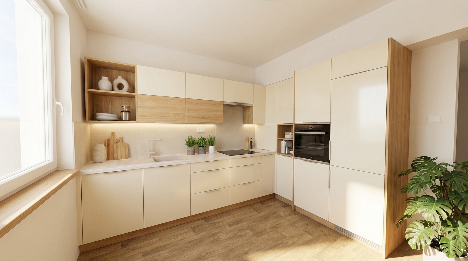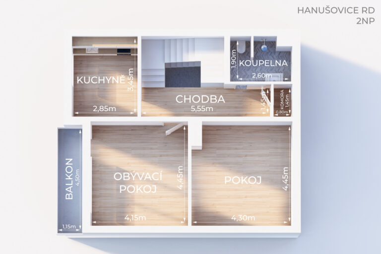 chodba, koupelna, komora, kuchyně, obývací pokoj se vstupem na balkon a ložnice