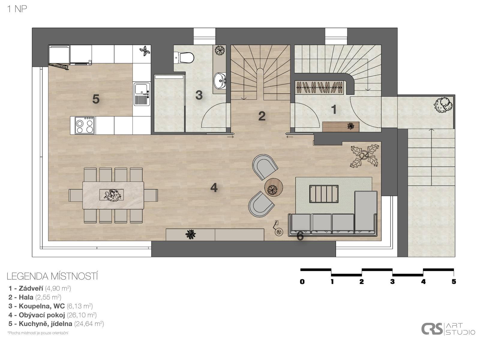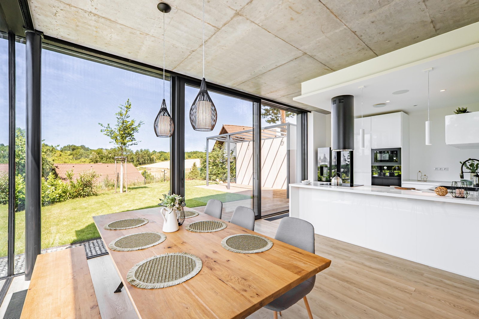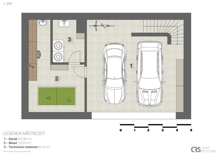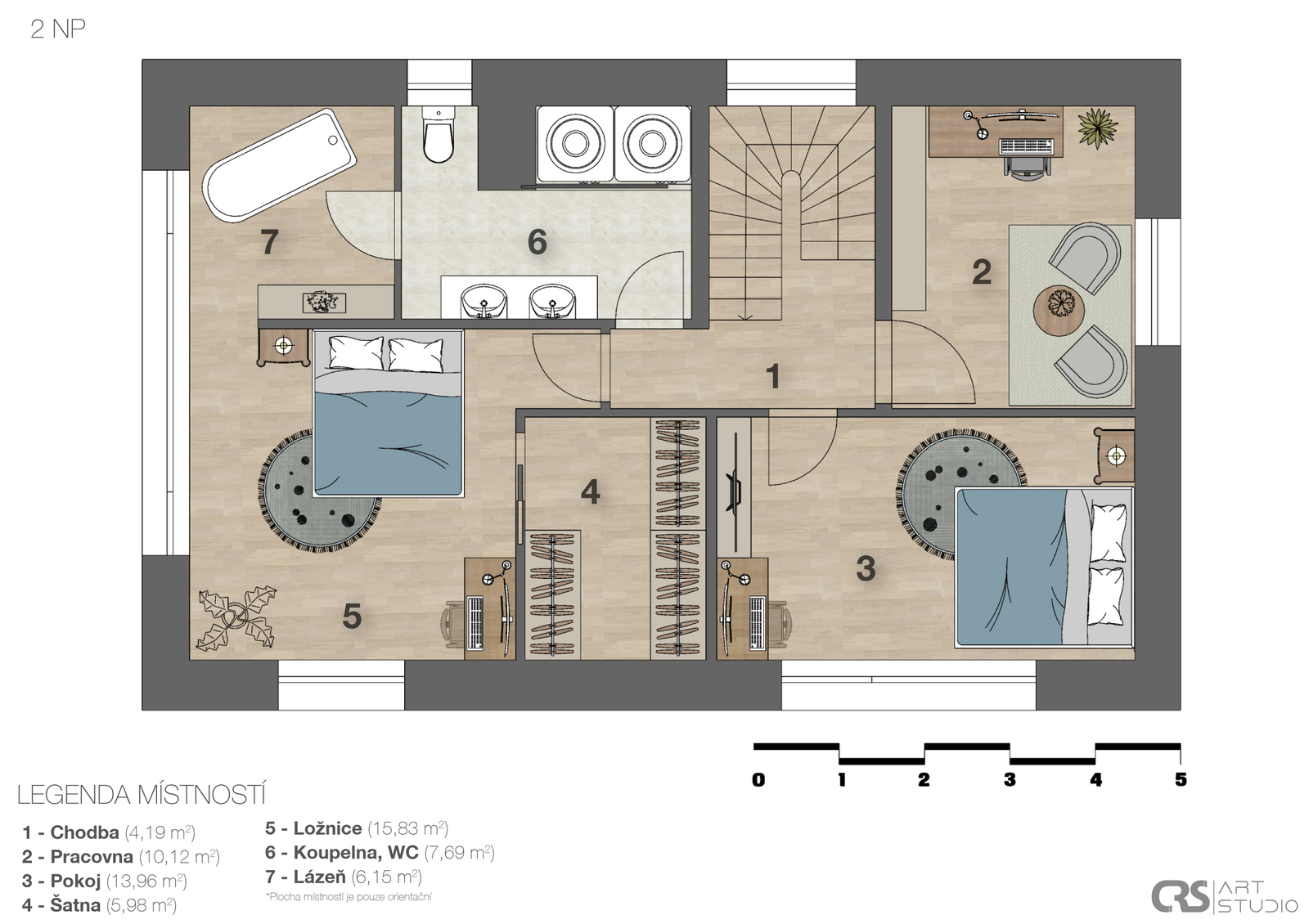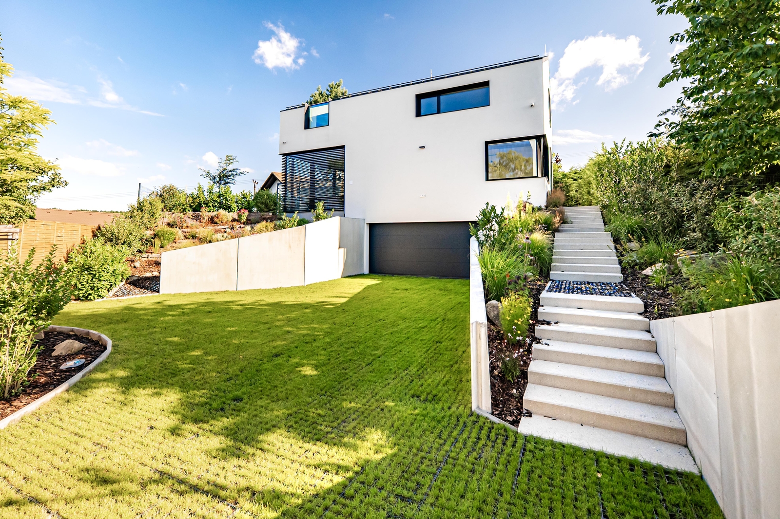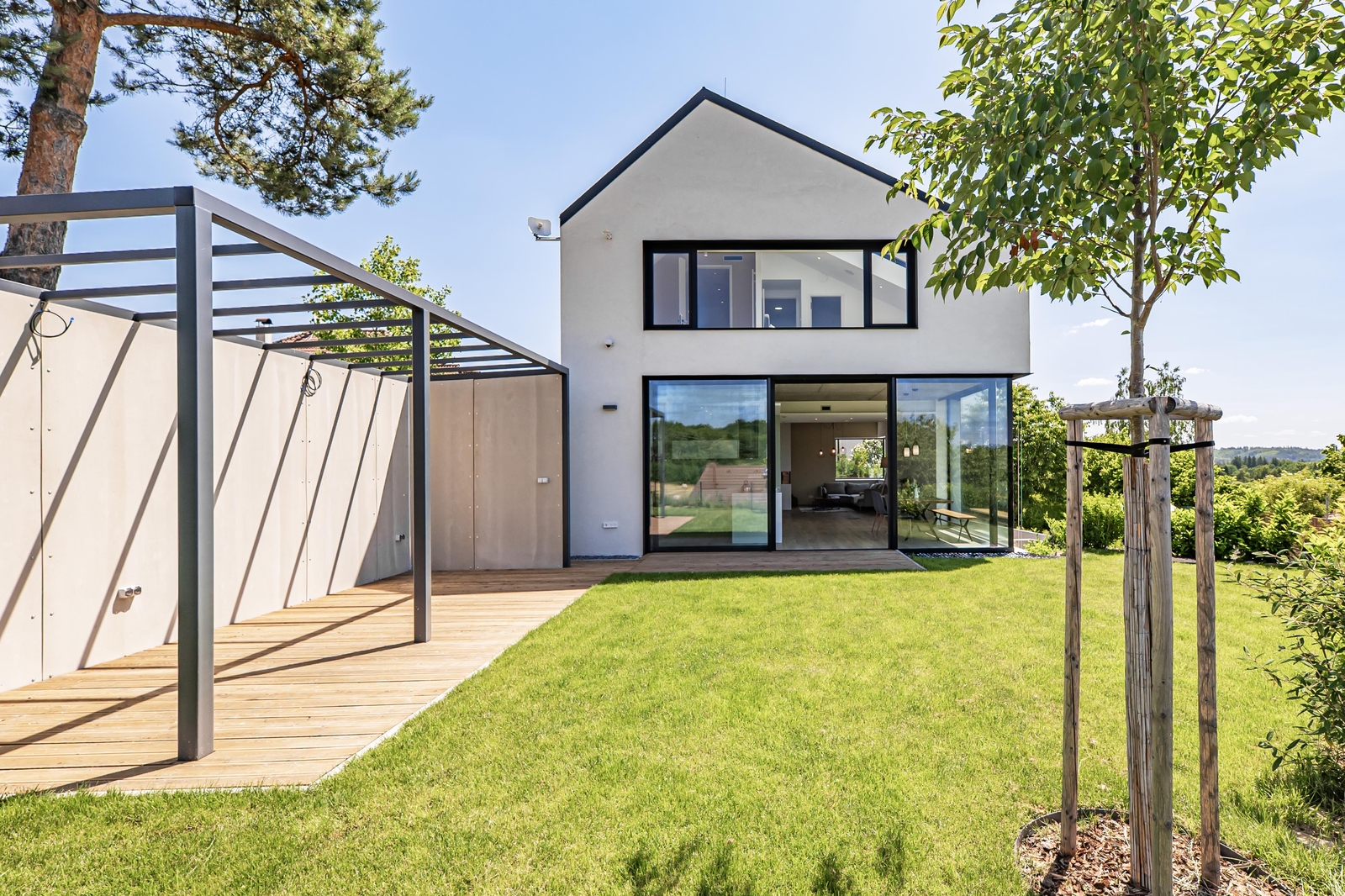 V přízemí domu se nachází vzdušný obývací pokoj s elektrickým krbem, který navazuje na jídelnu a kuchyni, jejíž součástí je americká lednice, parní trouba, mikrovlnná trouba a indukční varná deska s komínovou digestoří. Z jídelny je přes obrovské prosklení přímý vstup na terasu. Dále zde najdete zádveří s vestavěnou skříní a koupelnu s walk-in sprchovým koutem a černou sanitou. Po designovém schodišti vyjdete do patra, kde se nachází dětský pokoj, pracovna a ložnice se střešním oknem, ke které náleží šatna. Ložnice je otevřeným průchodem spojena s lázní, ve které můžete relaxovat a pozorovat západ slunce. Na lázeň navazuje koupelna se dvěma umyvadly a prostorem pro pračku a sušičku. V domě nechybí technická místnost a dva sklady s dostatkem úložného prostoru. Součástí je také garáž s kapacitou pro dva automobily. Na zahradě s pergolou a posezením je příprava pro vířivku.