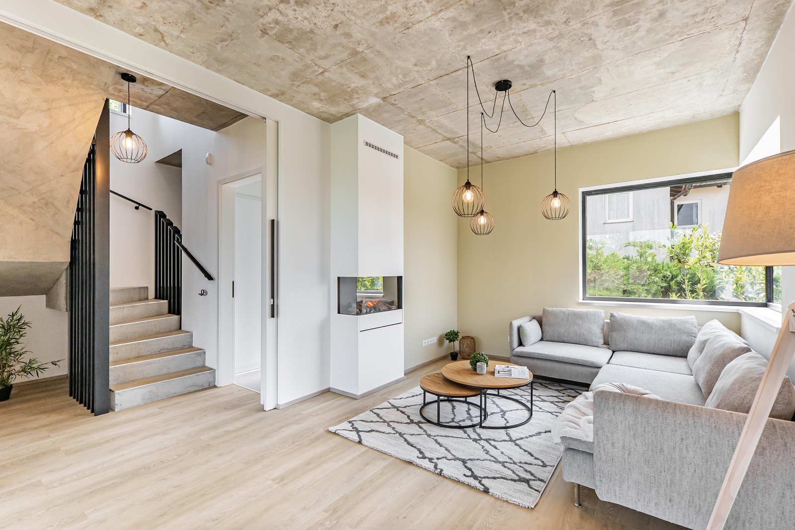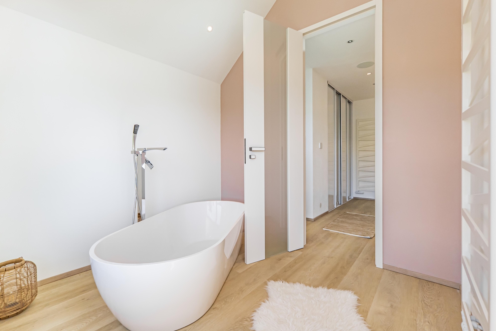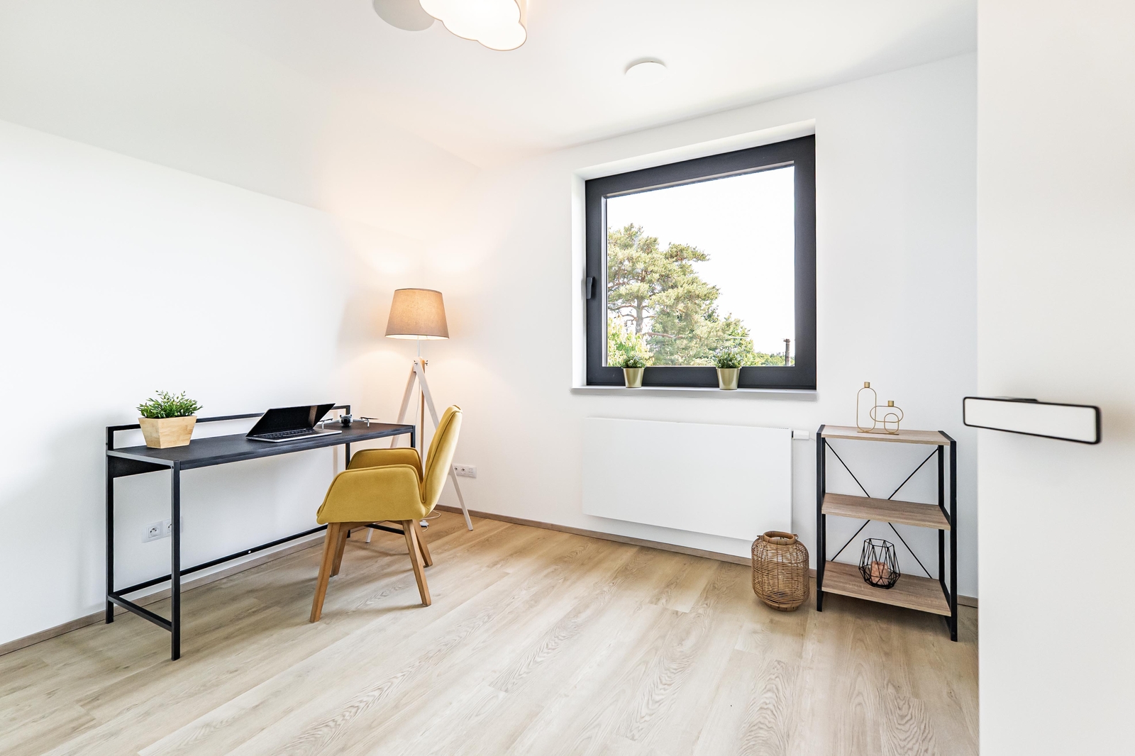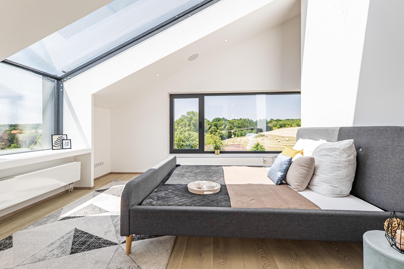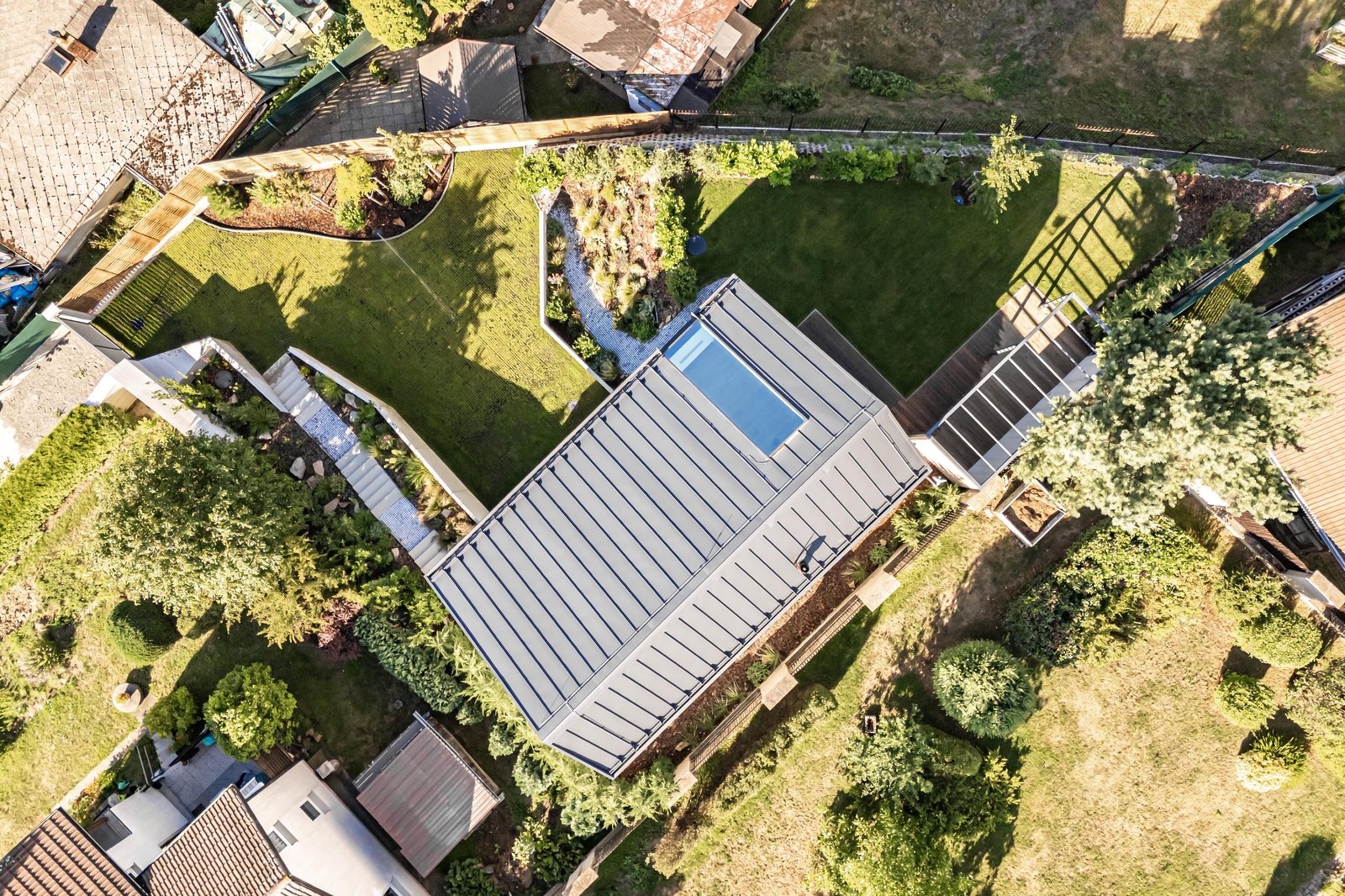 V přízemí domu se nachází vzdušný obývací pokoj s elektrickým krbem, který navazuje na jídelnu a kuchyni, jejíž součástí je americká lednice, parní trouba, mikrovlnná trouba a indukční varná deska s komínovou digestoří. Z jídelny je přes obrovské prosklení přímý vstup na terasu. Dále zde najdete zádveří s vestavěnou skříní a koupelnu s walk-in sprchovým koutem a černou sanitou. Po designovém schodišti vyjdete do patra, kde se nachází dětský pokoj, pracovna a ložnice se střešním oknem, ke které náleží šatna. Ložnice je otevřeným průchodem spojena s lázní, ve které můžete relaxovat a pozorovat západ slunce. Na lázeň navazuje koupelna se dvěma umyvadly a prostorem pro pračku a sušičku. V domě nechybí technická místnost a dva sklady s dostatkem úložného prostoru. Součástí je také garáž s kapacitou pro dva automobily. Na zahradě s pergolou a posezením je příprava pro vířivku.