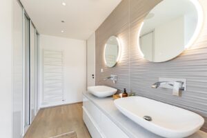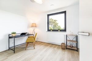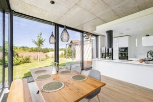 V celém domě jsou hliníková okna s trojskly a venkovními žaluziemi. Provětrávání zajišťuje centrální dvouzónová vzduchotechnická jednotka. Rekuperace a tepelné čerpadlo vzduch/vzduch v kombinaci s kvalitní izolací zaručuje, že po většinu roku není nutné přitápět elektrickým ústředním topením.