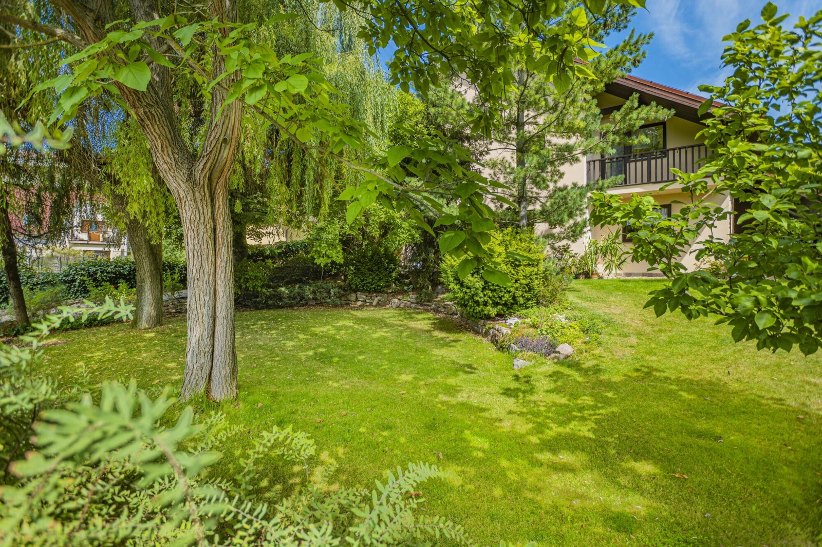 Exteriér zaujme velmi hezkou vrostlou zahradou se závlahovým systémem, která vám poskytne dostatek soukromí a prostoru pro relaxaci a rodinné aktivity.