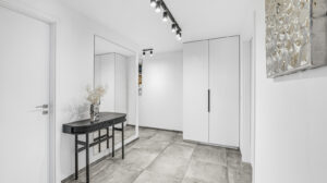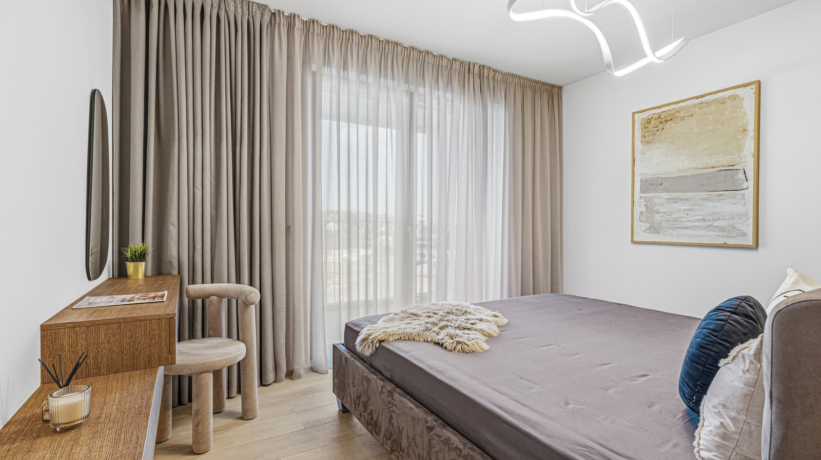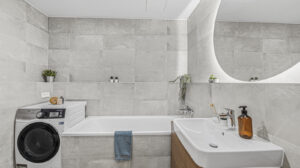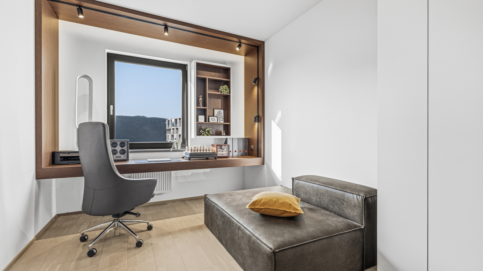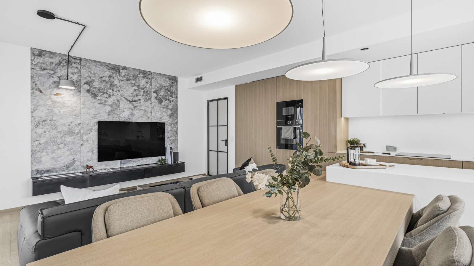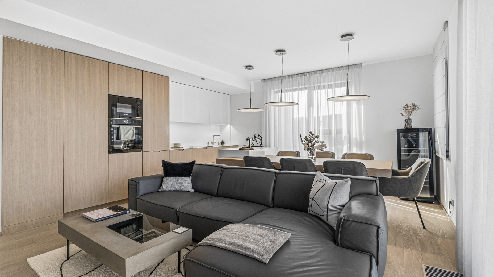 Byt zaujme především svým vzdušným a světlým interiérem, velkoformátovými dřevěnými okny s izolačním dvojsklem a kvalitními materiály. Dominantou je prostorný obývací pokoj s kuchyňským koutem, který je vybaven moderní kuchyňskou linkou se zabudovanými spotřebiči značky Bosch. Na obytnou část navazuje jídelní prostor a přímý vstup na terasu, která nabízí příjemné místo k odpočinku s výhledem do okolní zeleně.