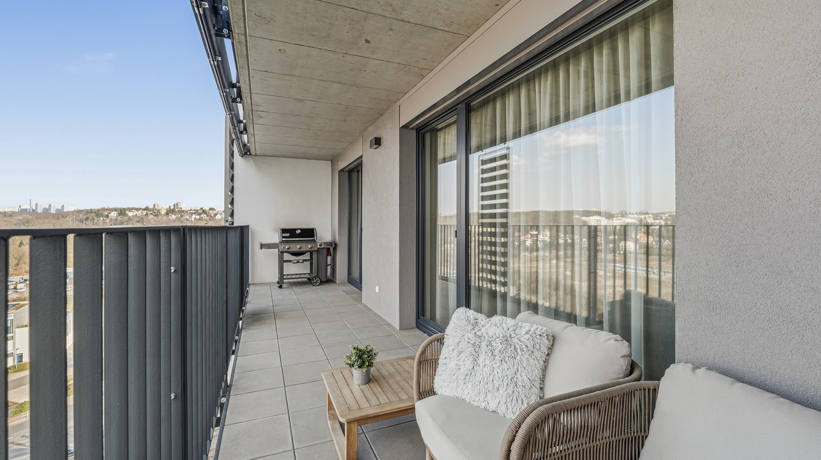 Nabízíme vám nadstandardní byt o dispozici 3+kk s užitnou plochou 88,1 m² a prostornou terasou o velikosti 17,5 m², který se nachází v 10. podlaží moderní novostavby z roku 2022, která je součástí oblíbeného projektu Zahálka v pražských Modřanech.