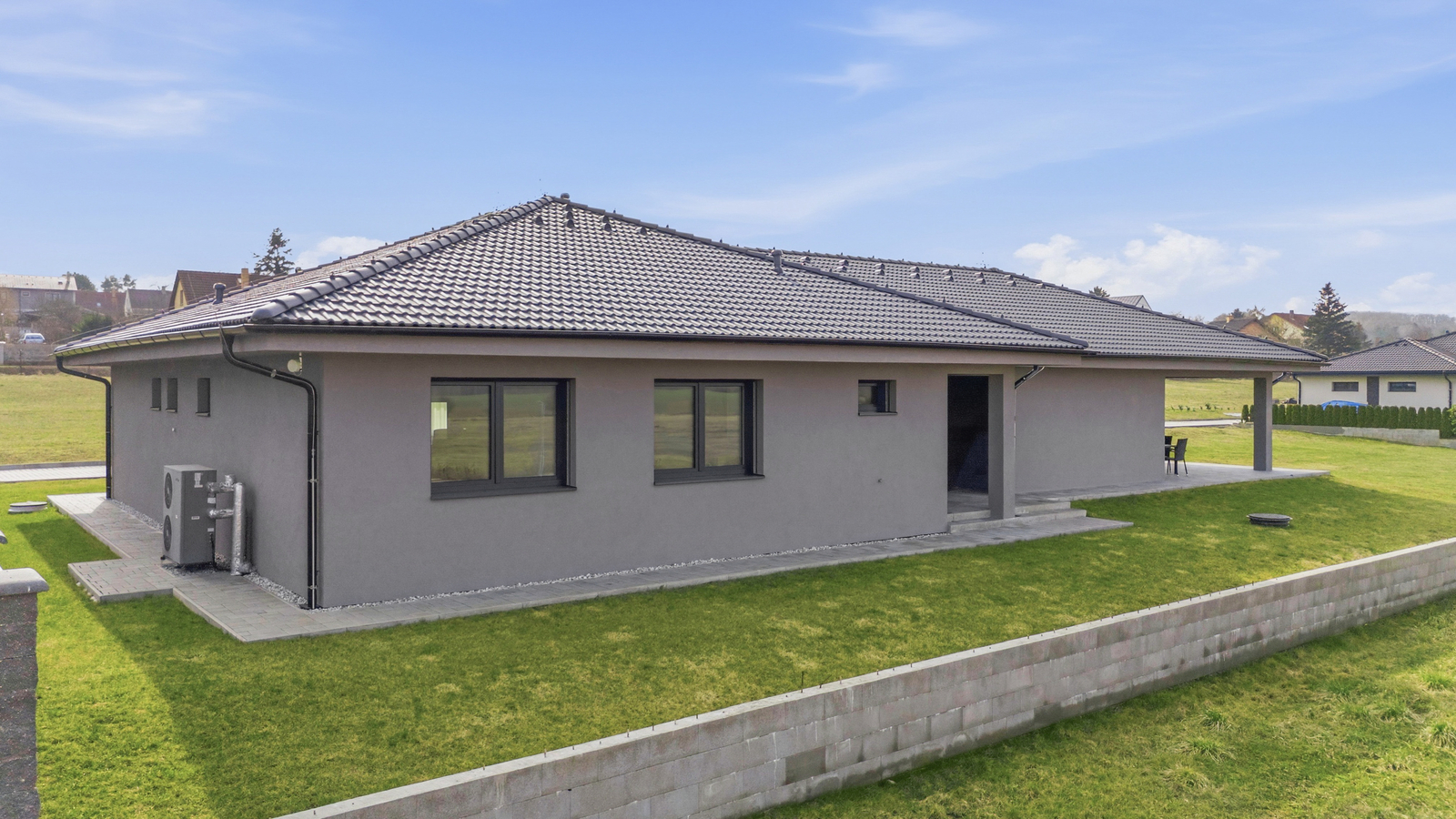 O vytápění i ohřev vody se stará tepelné čerpadlo vzduch–voda, které zajišťuje úsporný a efektivní provoz domácnosti. Energetická náročnost budovy spadá do velmi úsporné třídy B.