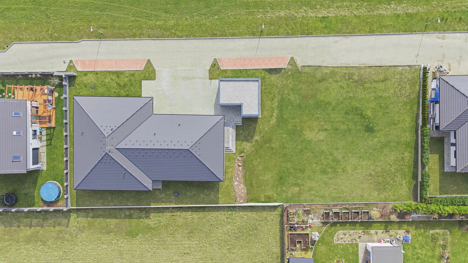 Exteriér nabízí dvě zastřešené terasy s přímým vstupem na pečlivě udržovanou zahradu, která poskytuje dostatek prostoru pro relaxaci i rodinná setkání. Na zahradě je umístěna betonová jímka na dešťovou vodu s čerpadlem a rozvodem do dvou míst zahrady, nechybí ani venkovní kohoutky na fasádě domu.