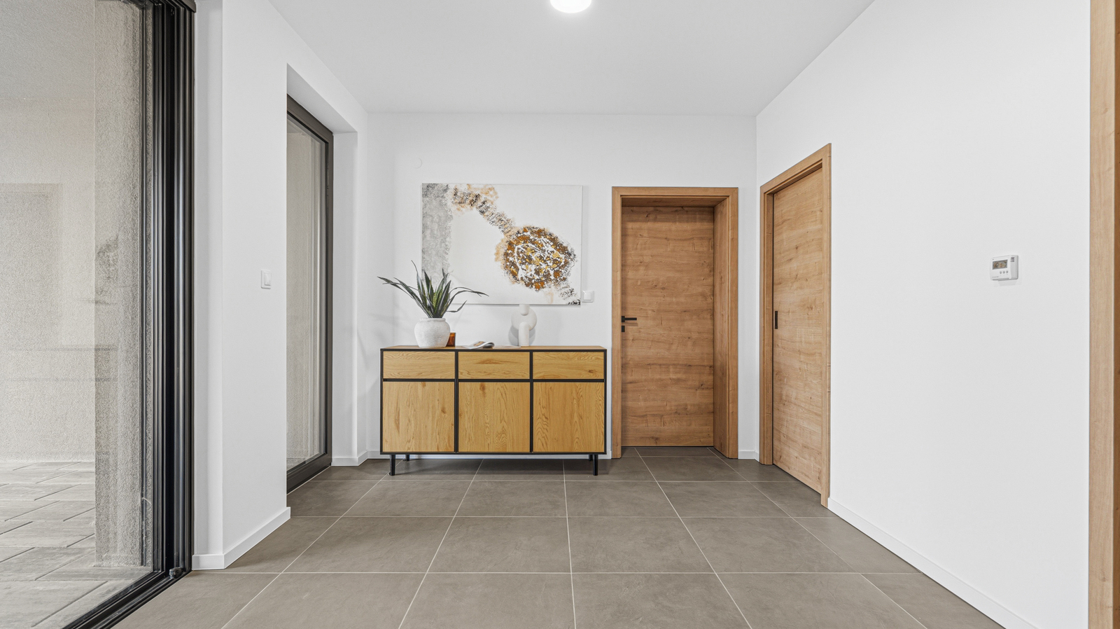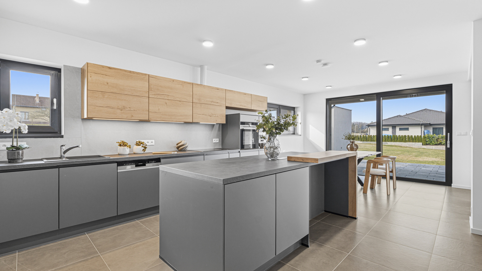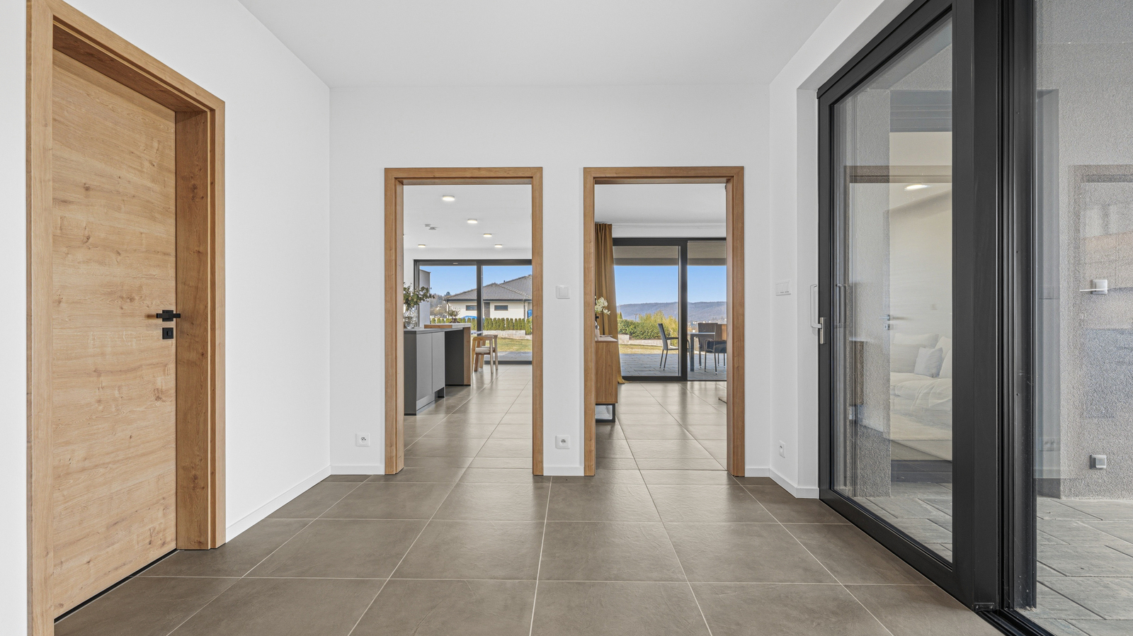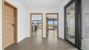Interiér domu je laděn v moderním stylu, podlahy tvoří kombinace lepeného vinylu a velkoformátové dlažby a příjemnou tepelnou pohodu zajišťuje podlahové vytápění. Design doplňují interiérové dveře s CPL laminátem v dekoru dubu s jemnou 3D strukturou. Dům je vybaven plastovými okny s trojskly, hliníkovými posuvnými portály a vše je opatřeno venkovními roletami.