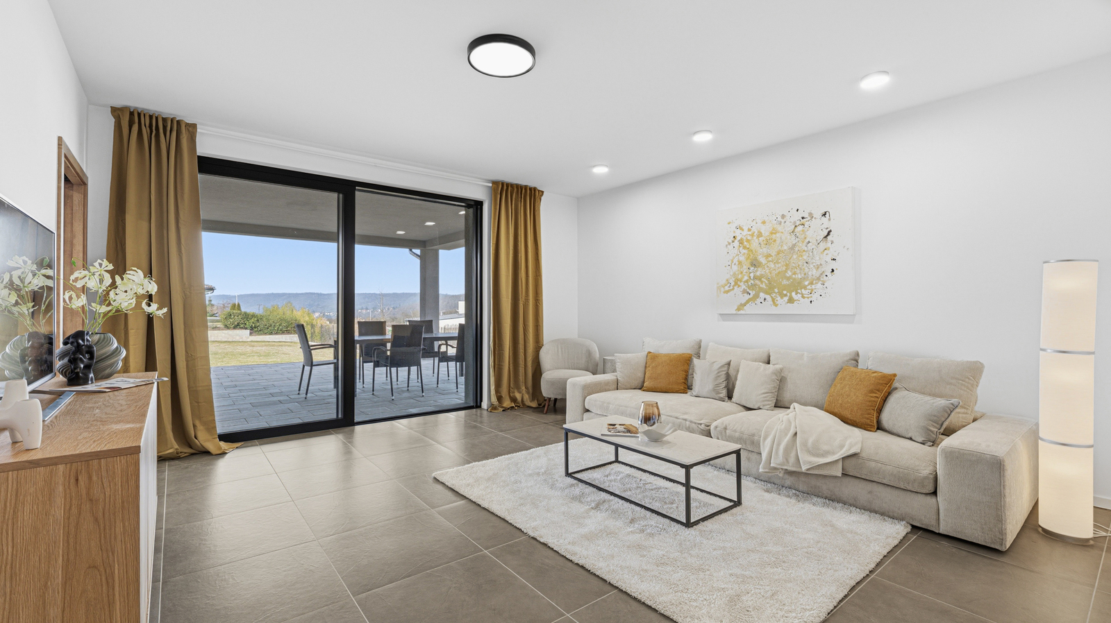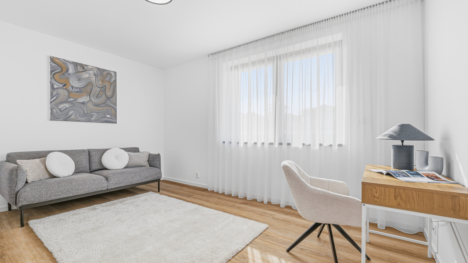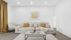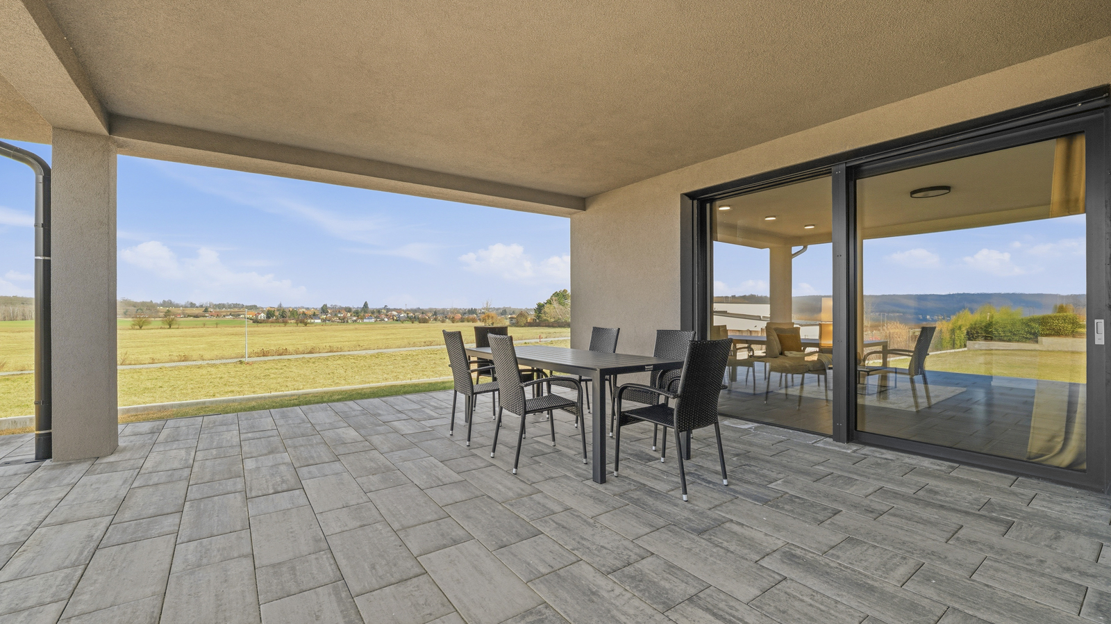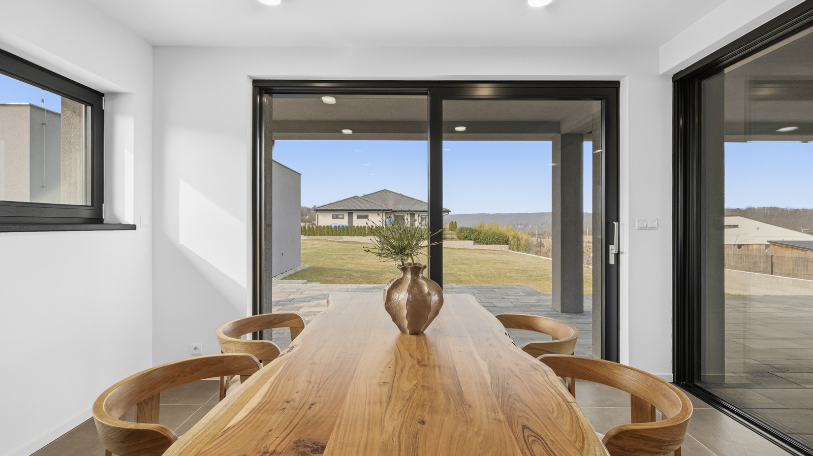 Interiér domu je laděn v moderním stylu, podlahy tvoří kombinace lepeného vinylu a velkoformátové dlažby a příjemnou tepelnou pohodu zajišťuje podlahové vytápění. Design doplňují interiérové dveře s CPL laminátem v dekoru dubu s jemnou 3D strukturou. Dům je vybaven plastovými okny s trojskly, hliníkovými posuvnými portály a vše je opatřeno venkovními roletami.