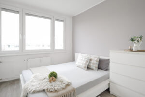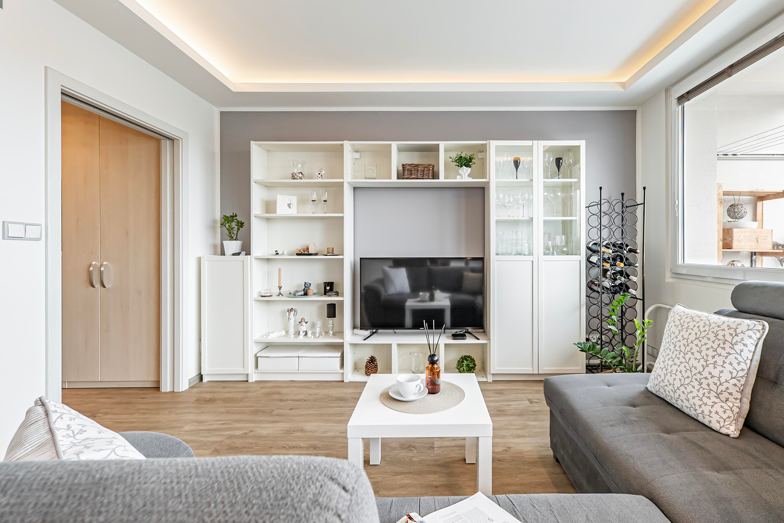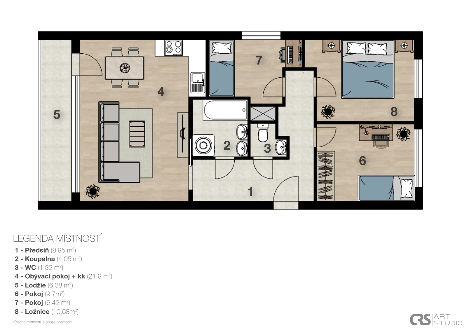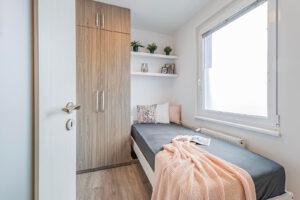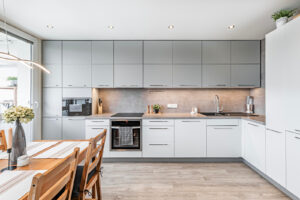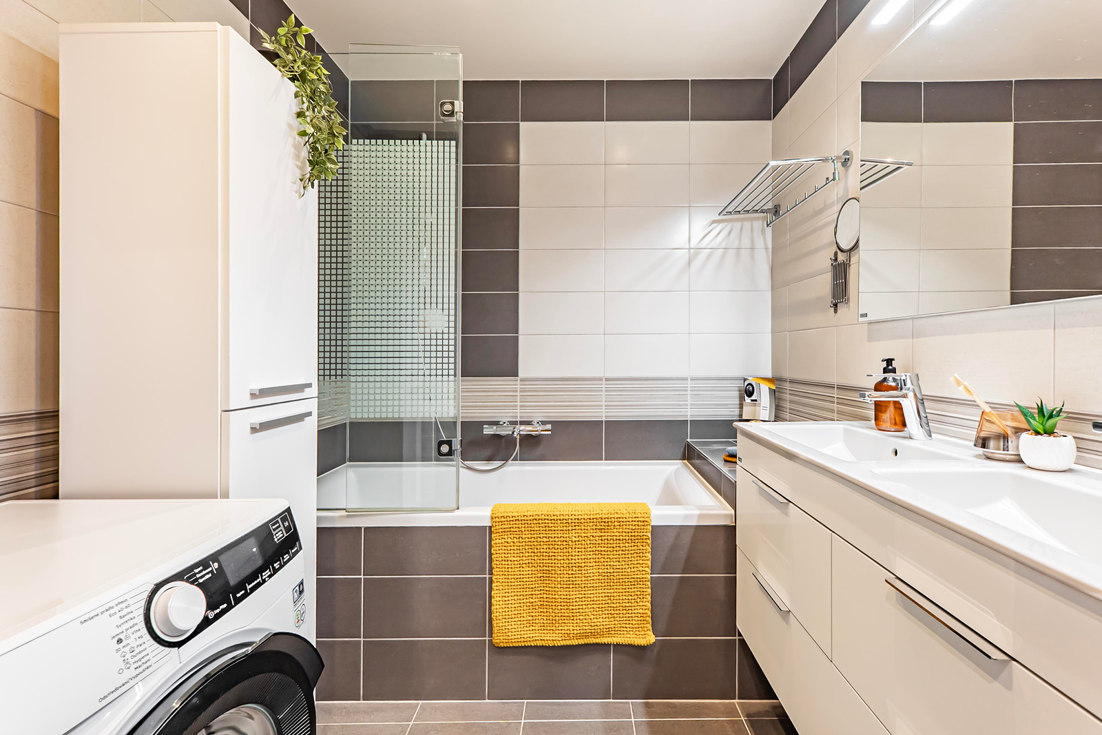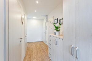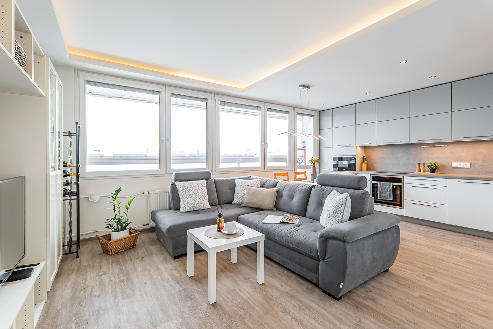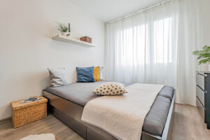 Interiér byl navržen s důrazem na pohodlí a moderní a komfortní styl bydlení. Obývací pokoj je propojen s kuchyní, což je ideální pro rodinné či přátelské setkání. Máte zde kuchyňskou linku na míru, která je vybavena zabudovanými spotřebiči a disponuje početnými úložnými prostory. Efektivní využití zajišťují vestavěné skříně v bytě. Koupelna je zařízena vanou se sprchovou zástěnou a koupelnovým nábytkem, který zahrnuje dvě umyvadla. Elegantní vzhled přináší plovoucí podlahy, v koupelně je položena keramická dlažba.