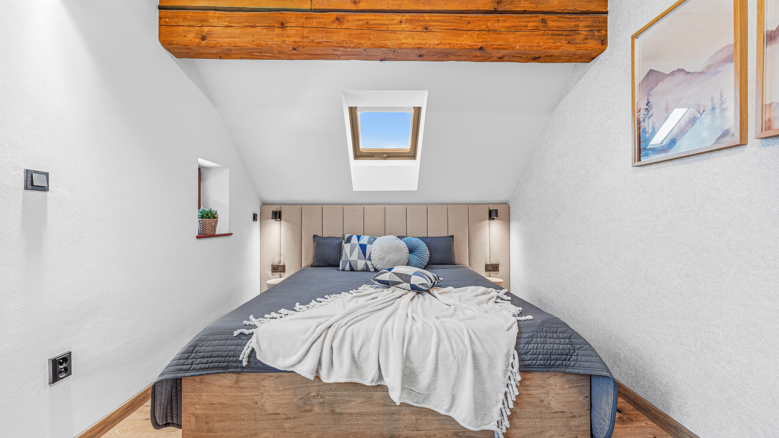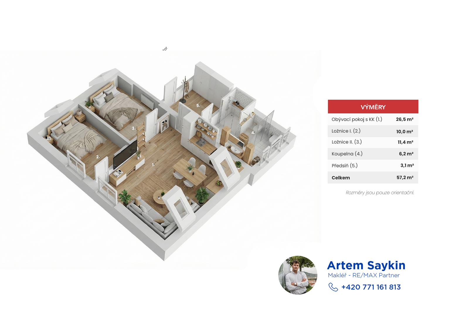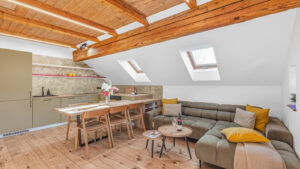 Apartmán má dispozici 3+kk o podlahové ploše 63,35 m² a navíc obytnou půdu o přibližné velikosti 26 m², která může sloužit jako další ložnice, pracovna nebo prostor pro hosty. Celkově tak získáte téměř 90 m² užitného prostoru.
