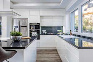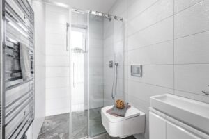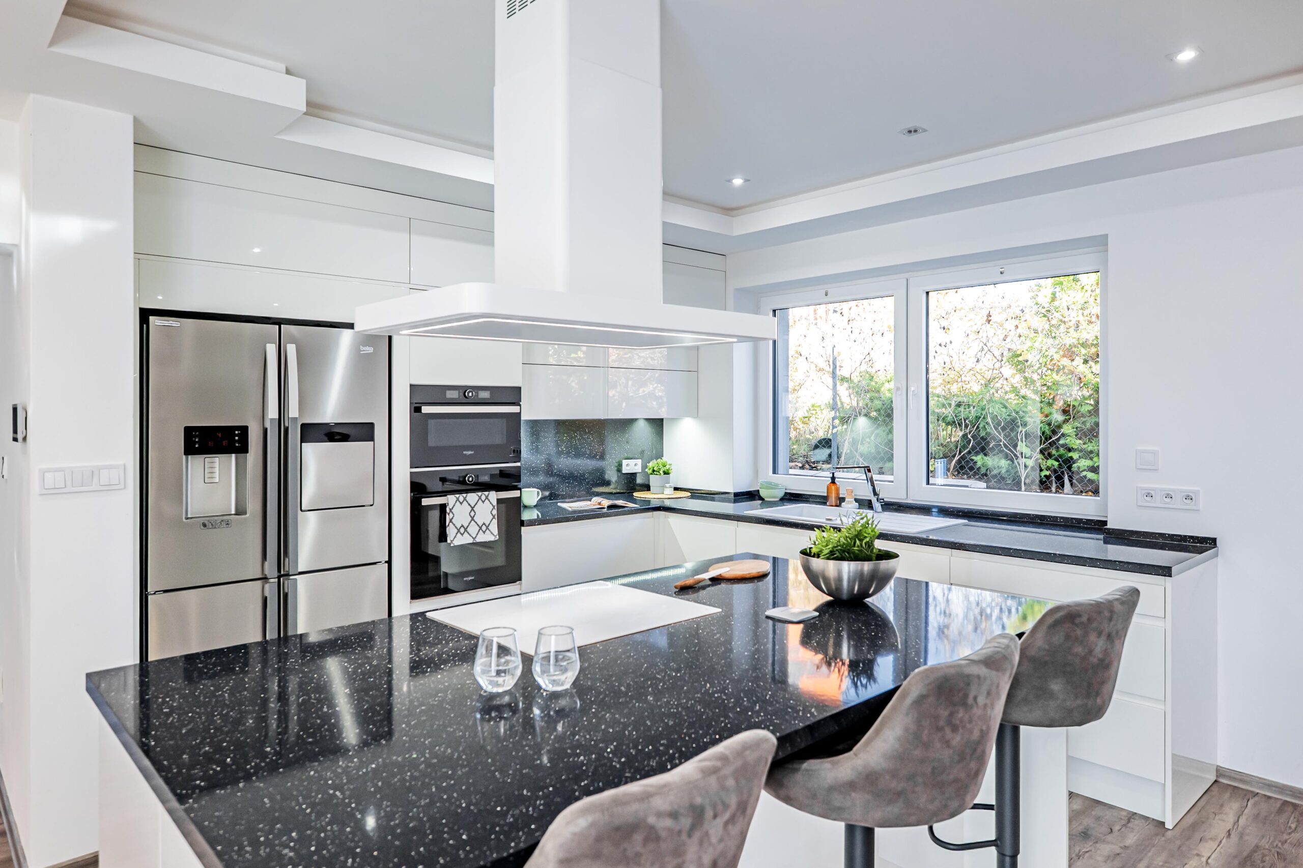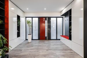 Skvělé izolační vlastnosti zaručí plastová okna s trojskly, vchodové dveře a posuvné portály jsou pak vyrobeny z hliníku. Dveře značky SAPELI a vinylové podlahy dodávají interiéru moderní a elegantní vzhled.