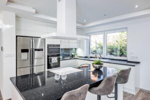 Dominantou domu je velmi prostorná místnost s přímým vstupem na terasu, která je rozdělena na obývací část s krbem a kuchyňskou a jídelní část vybavenou moderní kuchyňskou linkou se zabudovanými spotřebiči včetně myčky a americké lednice. Najdete zde tedy velký otevřený prostor ideální pro posezení s rodinou či přáteli. K pohodlí přispějí dvě koupelny a samostatná toaleta.