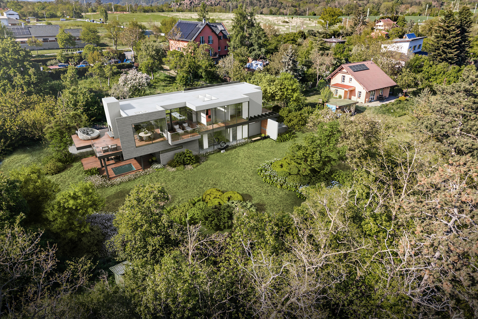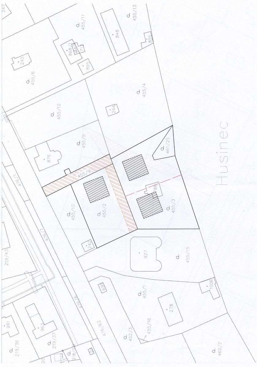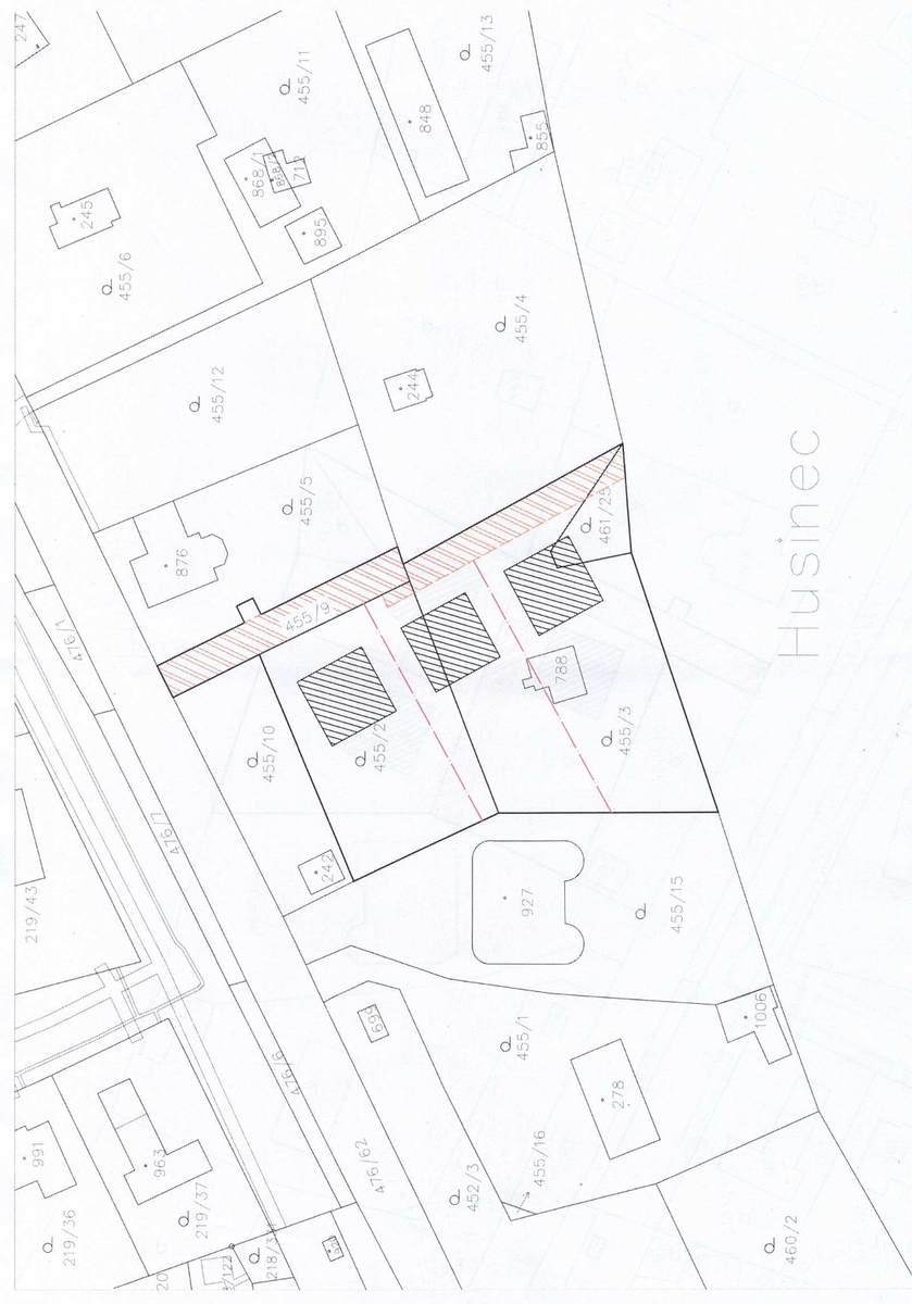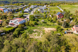 Soubor pozemků je připraven k rozdělení na tři samostatné pozemky pro výstavbu tří rodinných domů, každý se třemi bytovými jednotkami.