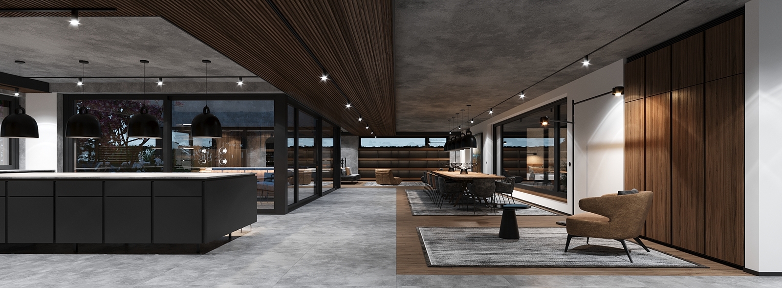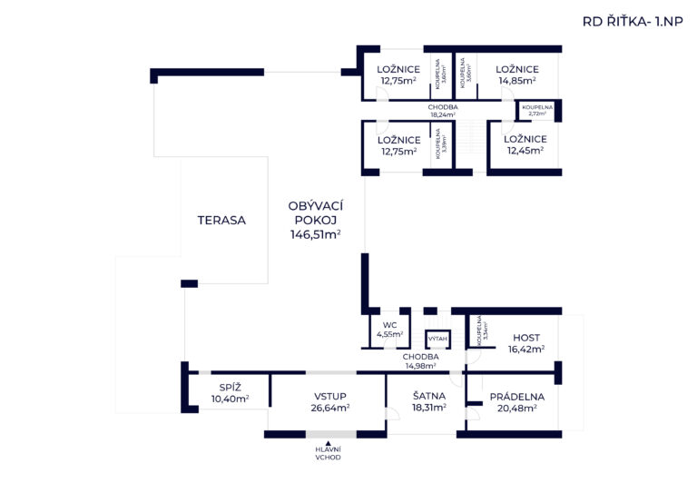 Hlavní obytné podlaží o ploše cca 375 m² tvoří otevřený prostor jako centrum celého domu. Dominantou je obývací část o velikosti 146 m² s přímým propojením na kuchyň, jídelnu a terasu orientovanou do zahrady. Dále zde najdete vstupní halu, šatny, hostinský pokoj, koupelnu a prádelnu.