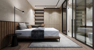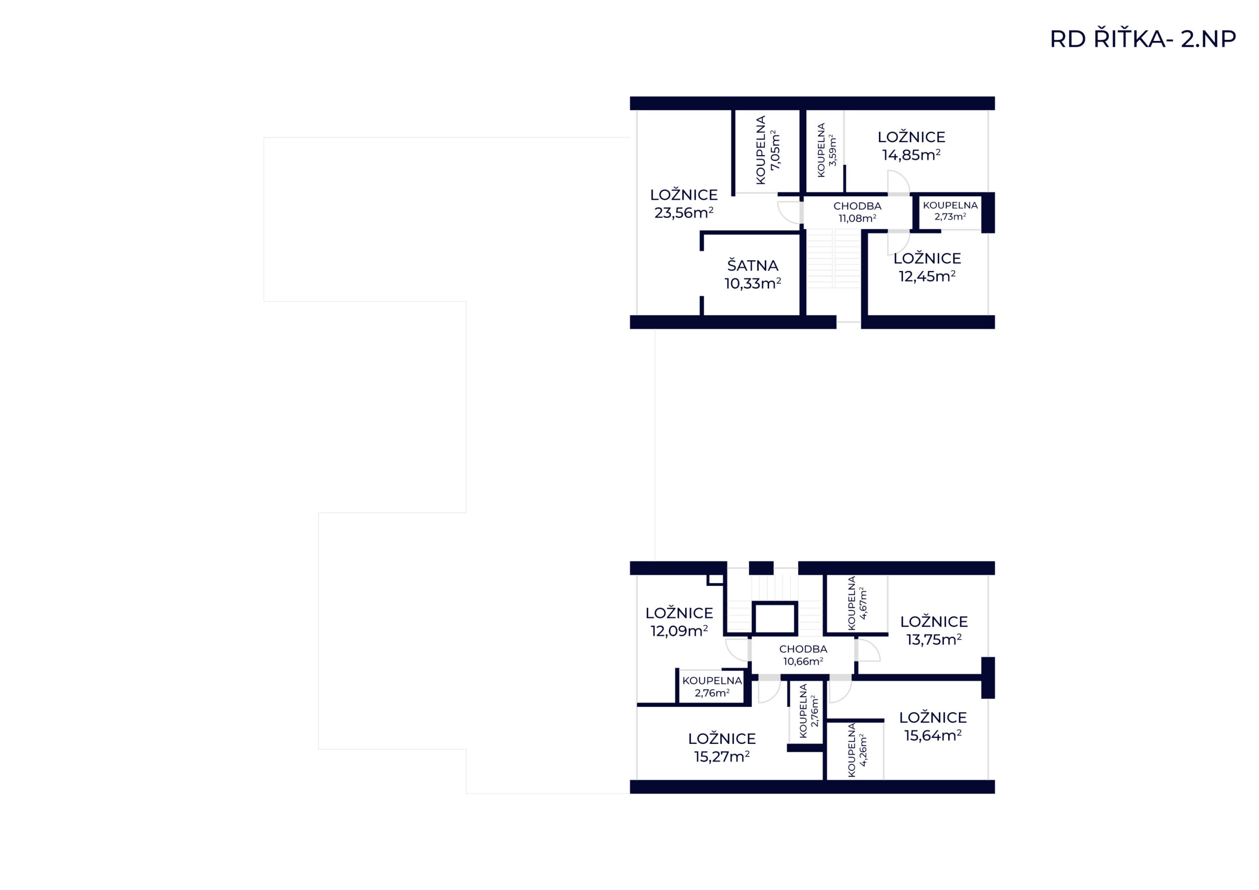 Horní podlaží o výměře cca 156 m² nabízí soukromou část domu s několika ložnicemi, koupelnami a šatnami.