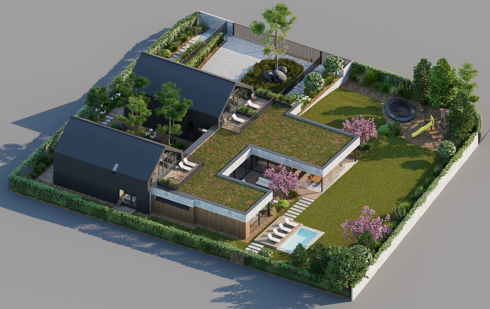 Užitná plocha domu dosahuje téměř 660 m² a je rozložena do tří podlaží.