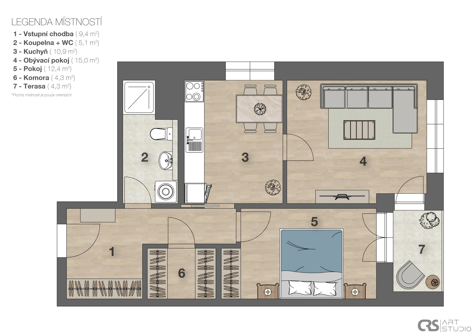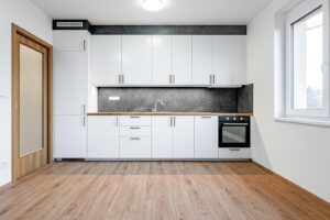 Vybavení bytu zahrnuje novou moderní kuchyňskou linku s vestavěnými spotřebiči (lednice, mrazák, indukční deska, trouba, myčka). V koupelně je prostorný sprchový kout, toaleta, umyvadlo, otopný žebřík a přípojka na pračku. Byt je prostorný a světlý díky velkým oknům. V předsíni najdete místo pro šatní skříň a komora přímo v bytu poskytne dostatek úložného prostoru.