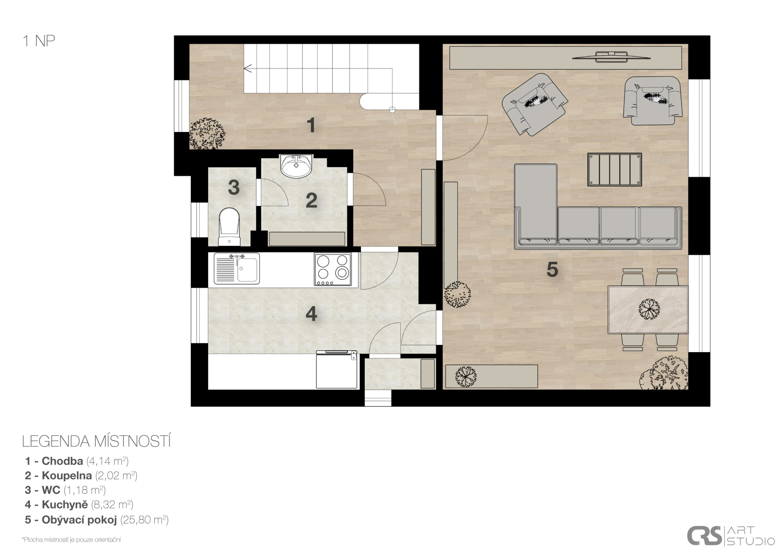 1. nadzemní podlaží: kuchyň, obývací pokoj a samostatné WC