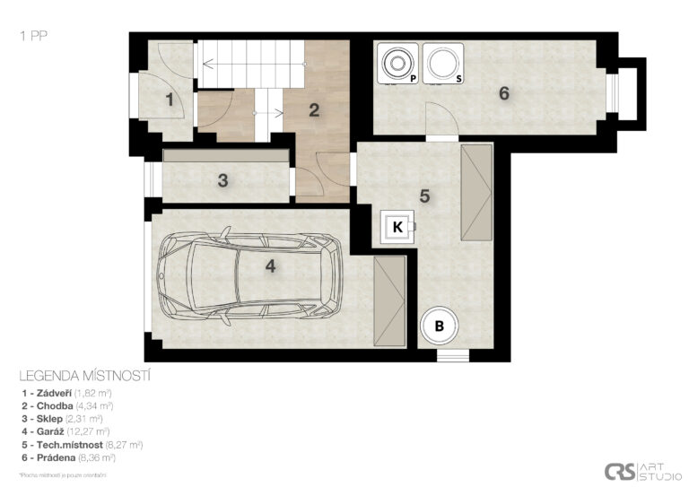 0. suterén: vstupní část, pokoj, sklep, kotelna, prádelna