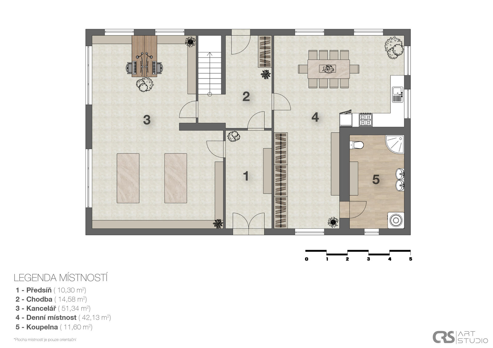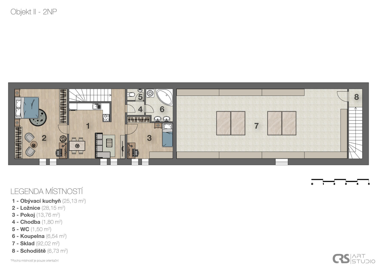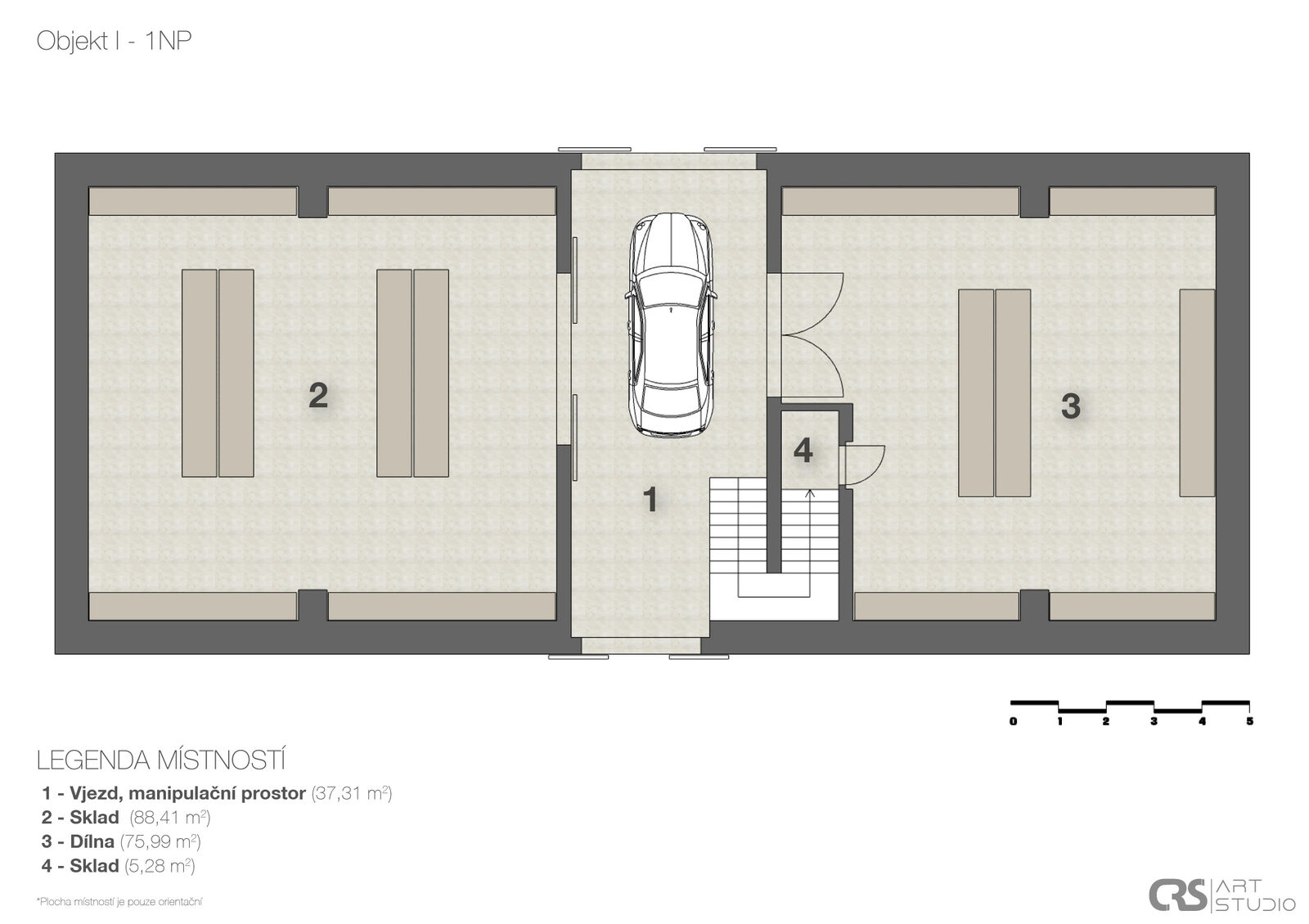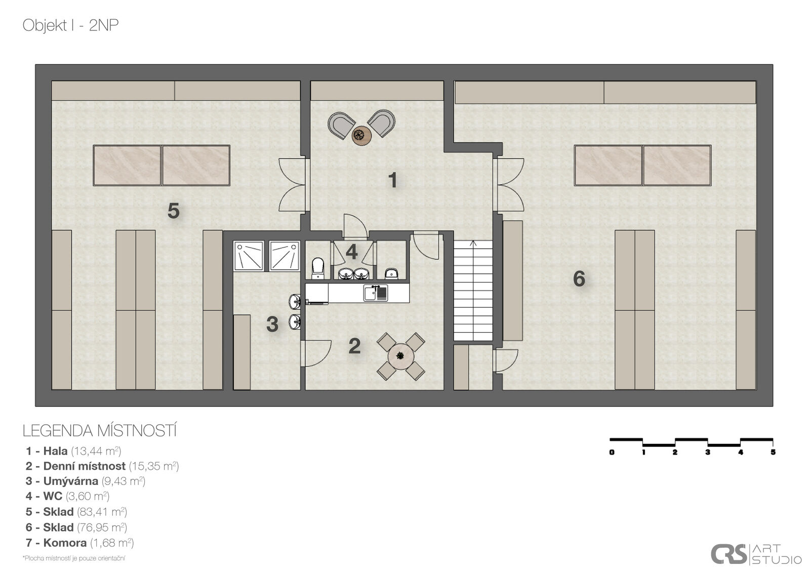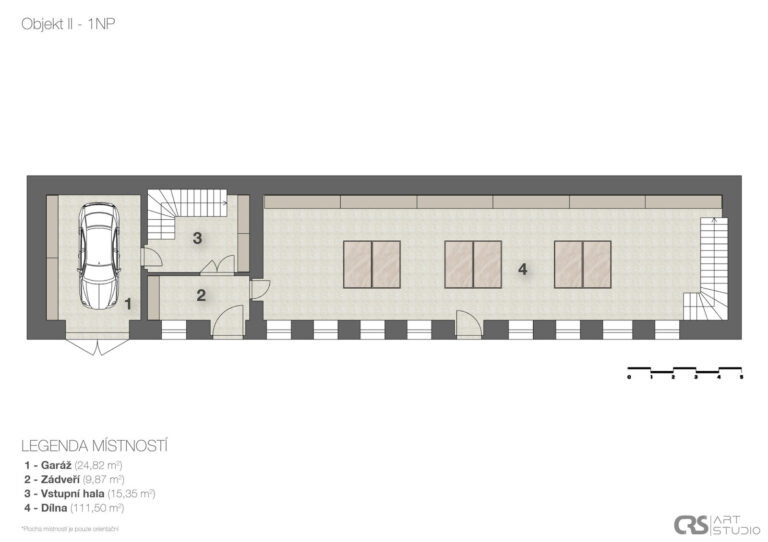 Prvním objektem v areálu je hlavní budova, která se skládá ze 2 velkých místností, chodby, podkroví a přízemí disponuje užitnou plochou 133 m2. Druhá budova je stodola s užitnou plochou 215 m2 a třetím objektem je dílna o 3 místnostech s podkrovím a užitnou plochou 159 m2 v přízemí, dílna má 2 obytné místnosti a třetí místnost je výrobní prostor. Půdní prostory nad dílnou i v hlavní budově mají stejný půdorys jako objekty a stejnou užitnou podlahovou plochu. Dále jsou zde menší původní sklípky.