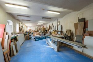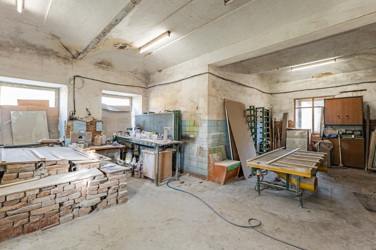 Vybavení zahrnuje plastová okna a dveře v dílně. V hlavní budově jsou okna starší dřevěná, stejně tak jako schodiště a dveře. Na podlahách najdete dlažbu, pouze v dílně je litá pryskyřice.