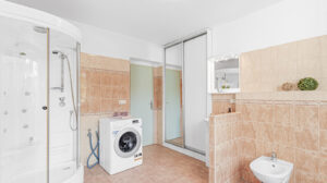 Dominantou obytné části je prostorný obývací pokoj s krbem a jídelním koutem, který je propojen s kuchyní. Součástí domu je také koupelna se sprchovým koutem a WC, kde je instalováno elektrické podlahové vytápění pro vyšší komfort.