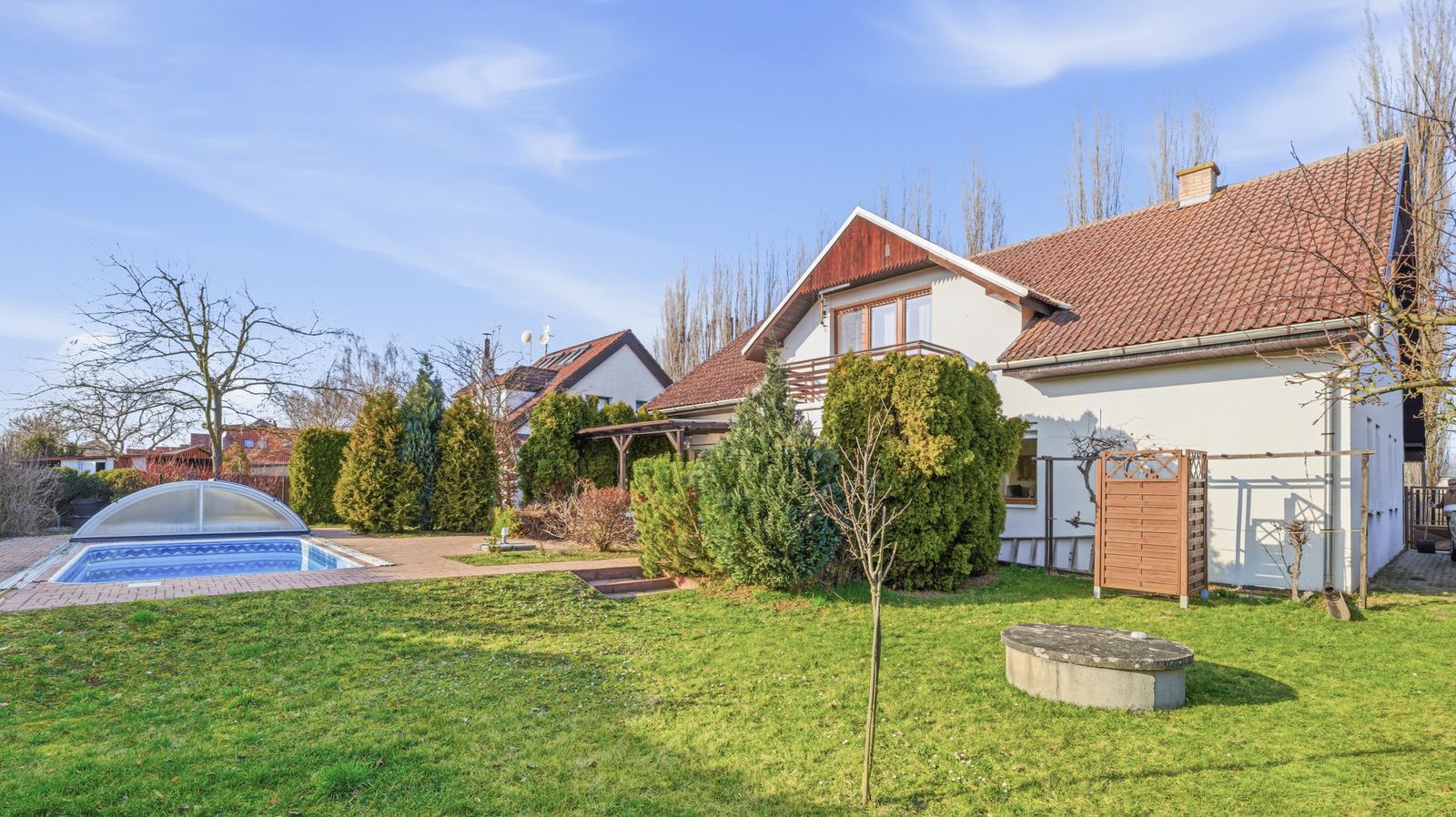 Velkou předností domu je zahrada poskytující dostatek soukromí i prostoru pro relaxaci. Dominantou je bazén s posuvným zastřešením, vyhřívaný tepelným čerpadlem, který umožňuje koupání po větší část roku. Na pozemku se nachází také studna pro zalévání zahrady, upravené okrasné porosty a venkovní udírna s grilem, ideální pro letní posezení s rodinou a přáteli.